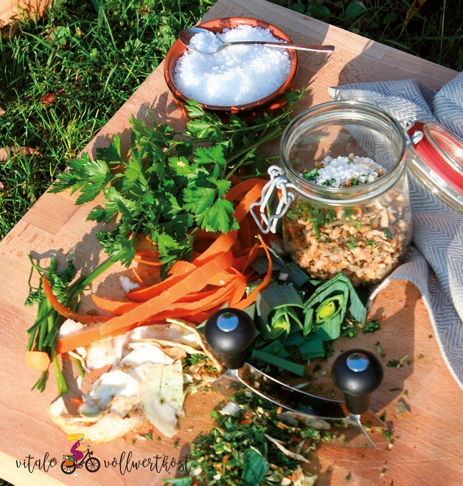 Es fallen über den Tag immer mal kleinere Gemüsereste an. Diese hacke ich sofort klein und lasse ich sie auf einem Küchenbrett oder ein Blatt Küchenrolle etwas abtrocknen, manchmal bis Abends. Im Kühlschrank steht bei mir dafür immer ein großes Glas mit Schnapp- oder Schraubverschluss. Hier gebe ich auf eine große Handvoll gehacktes Gemüse hinein und ca. 1 TL Salz obenauf.