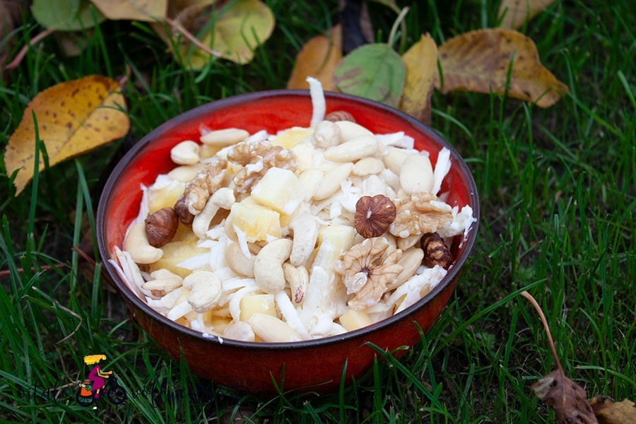 Wie wäre es bei dieser Variante mit Haselnüssen? Ob ganz, gehackt oder geröstet, überlasse ich Euren persönlichen Vorlieben. Auch die Haselnüsse mögen ein frisches Wasserbad vor dem Verzehr.