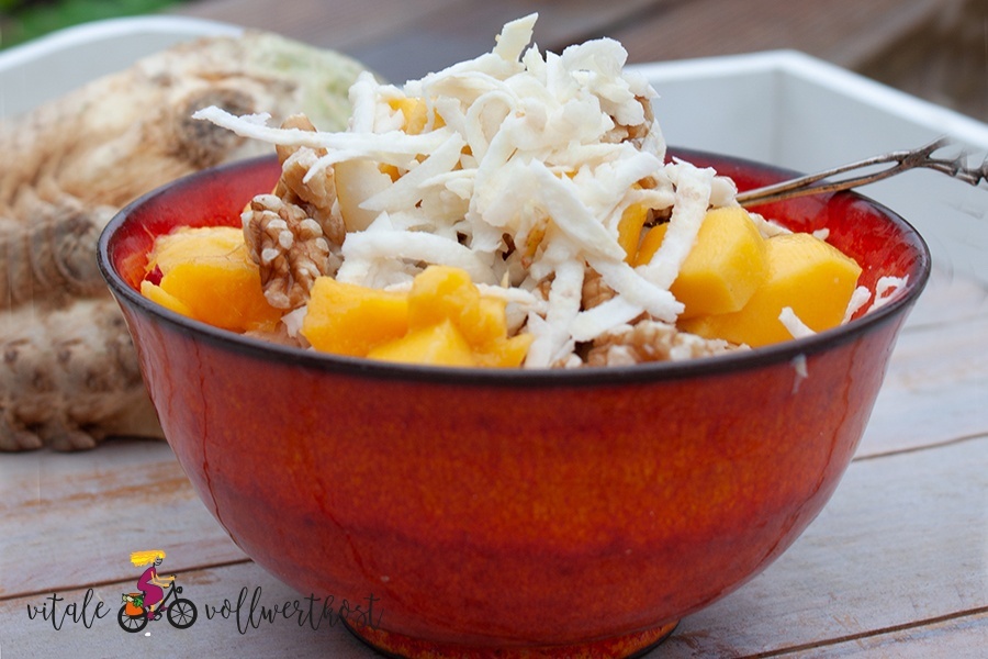 Als Sellerie-Birnen-Salat ist er vielen als Waldorffsalat bekannt. Ich gebe gern noch gedörrte Pflaumen aus meinem Garten dazu.